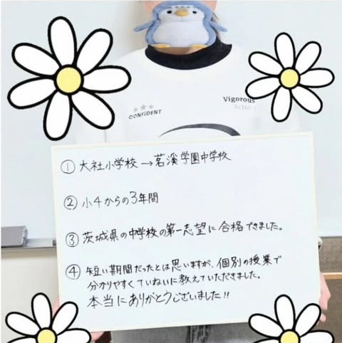 合格実績(一人につき一校のみ記載)やコースの詳細・費用、塾長日記や塾長あいさつで私の考えなど、全て当ホームページに記載しております。ご興味をいただけましたら是非お問い合わせください。