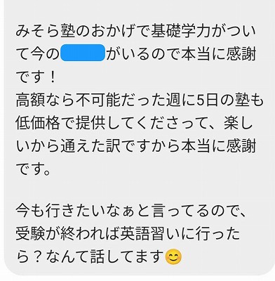 結局、塾には属さず難関高校対策講座を受けて〇高校に合格することができました。合格できたのはみそら塾に通っていたおかげだと感謝の気持ちでいっぱいです。