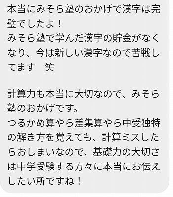 みそら塾には小学校6年生からお世話になりました。数学の土台をしっかりしておきたかったのがきっかけです。塾に通い始めてから算数が好きになり、中学での数学も不安なく入ることができ、ぐんぐん伸びてく様子がとても印象に残っています。